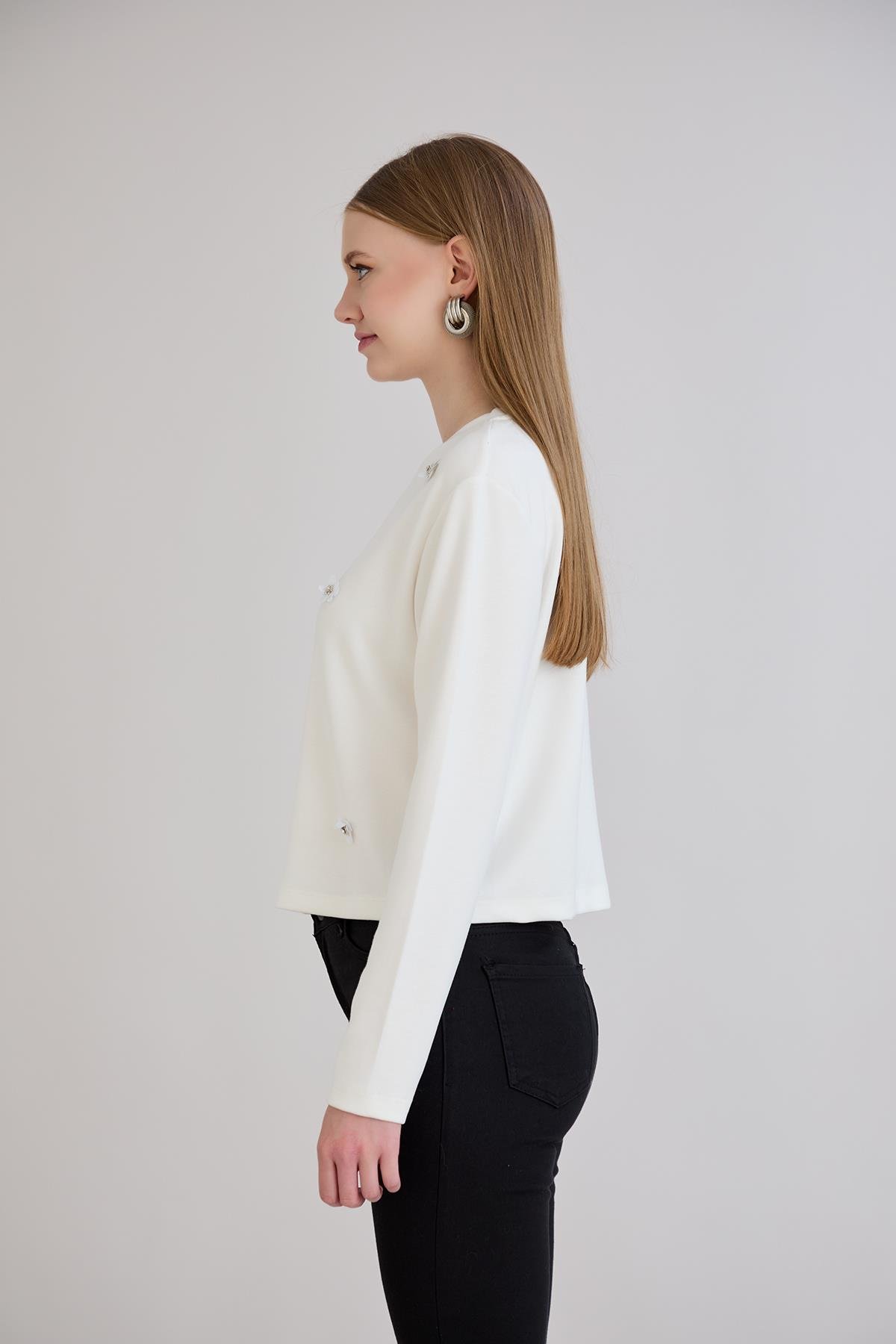 Çiçek Aksesuarlı Modal Bluz Ekru (1096)