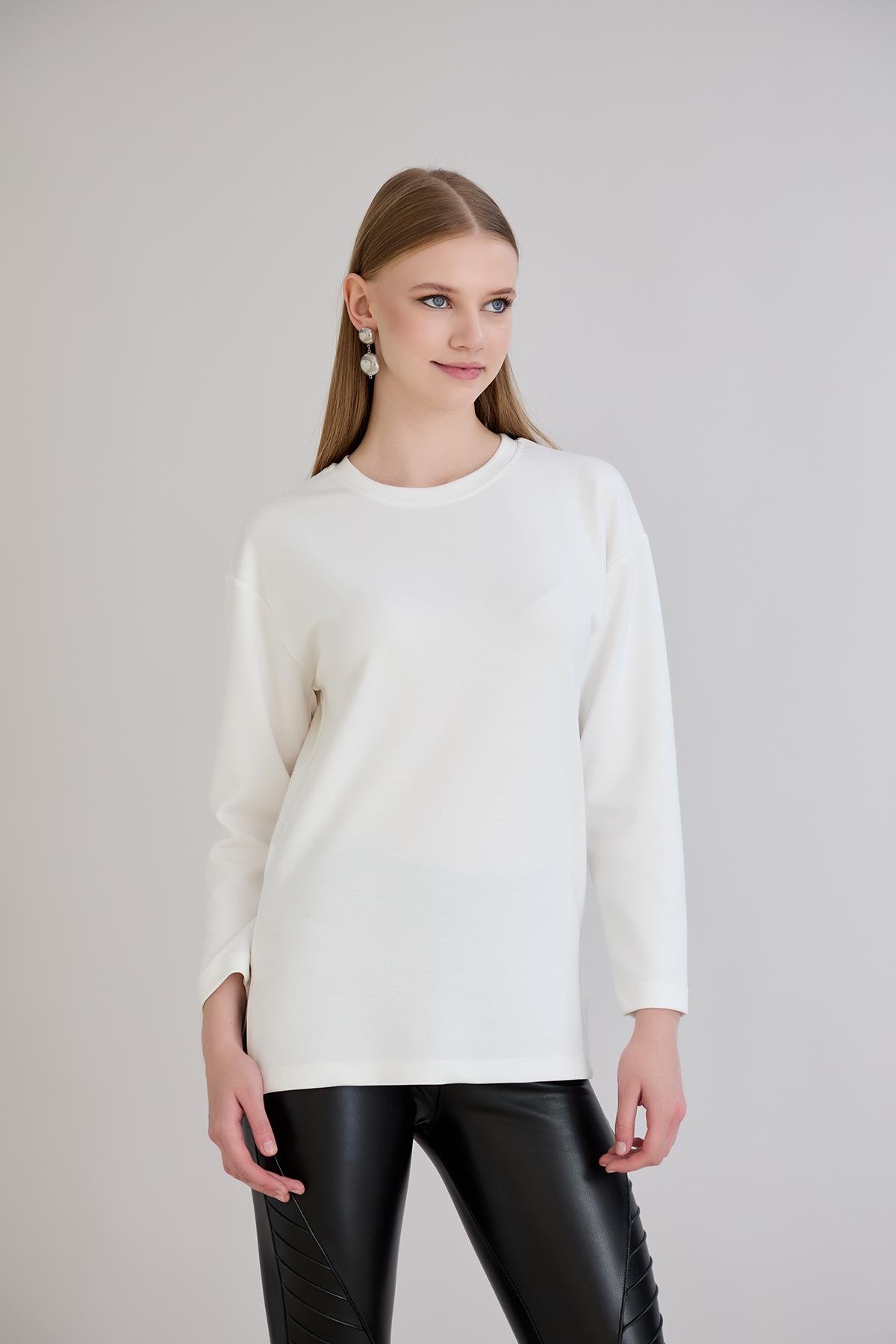 424 - U.Kol Yırtmaçlı Basic Tshirt Ekru (1091)