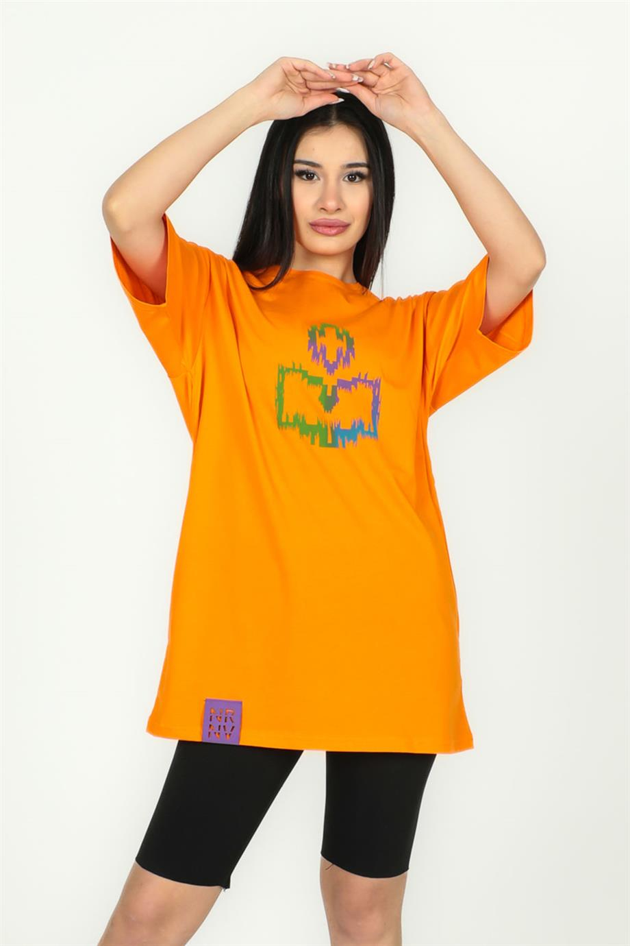 Dijital Kalp Baskılı Over Size t-shirt Oranj (1002)