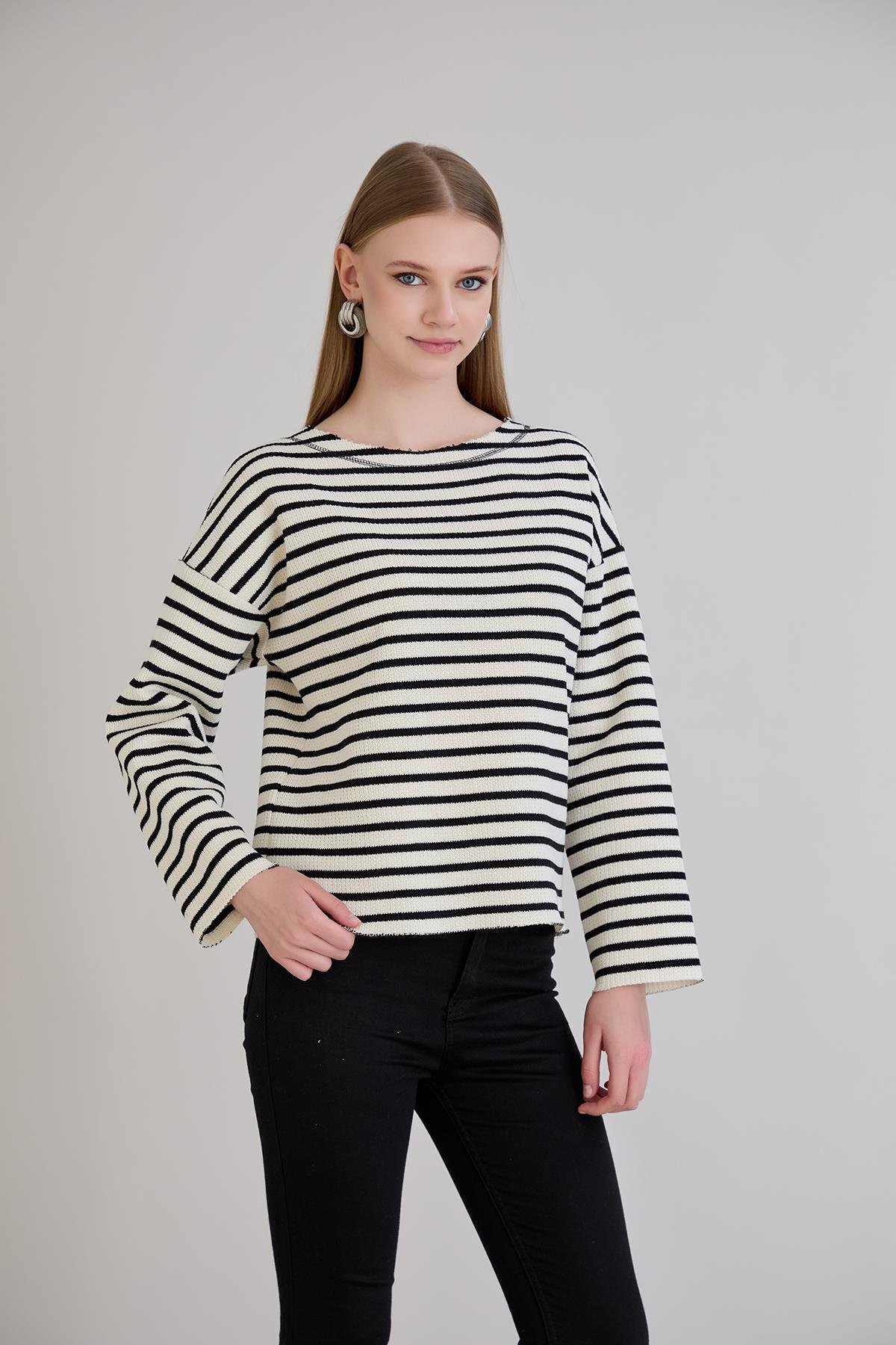 Dikiş Detay Çizgili Sweatshirt Siyah (5079)
